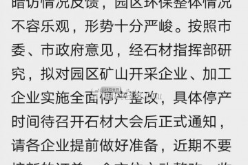 預 通 知各礦山開采企業(yè)、園區(qū)加工企業(yè):根據環(huán)保督察組兩次到園區(qū)暗訪情況反饋,園區(qū)環(huán)保整體情況不容樂觀,形勢十分嚴峻。按照市委、市政府意見,經石材指揮部研究,擬對園區(qū)礦山開采企業(yè)、加工企業(yè)實施全面停…