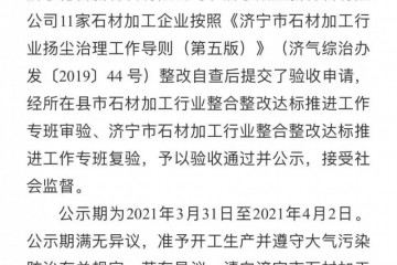 石材加工企業(yè)達(dá)標(biāo)驗(yàn)收公示山東福源石業(yè)有限公司、山東眾興石業(yè)有限公司、汶上縣眾騰石業(yè)有限公司、山東三聯(lián)石業(yè)有限公司、汶上縣暢達(dá)石業(yè)有限公司、山東云慧石業(yè)有限公司、汶上縣恒發(fā)石材有限公司、山東鑫興石業(yè)…