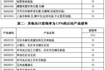 近日,財(cái)政部、稅務(wù)總局聯(lián)合發(fā)文,提高部分產(chǎn)品的出口退稅率。2020年3月20日起(以出口貨物報(bào)關(guān)單注明的出口日期為準(zhǔn)),包括“已加工板巖及板巖制品”等5個(gè)稅則號(hào)的石材產(chǎn)品在內(nèi)(表一),共有1084個(gè)稅則號(hào)的產(chǎn)…