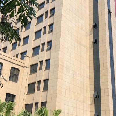江西菊花黃花崗巖外墻干掛工程 石材干掛法又名空掛法。是目前墻面裝飾中一種新型的施工工藝。該方法以金屬掛件將飾面石材直接吊掛于墻面或空掛于鋼架之上,不需再灌漿粘貼。其原理是在主體結構上設主要受力點,通過金屬掛件將石材固定在建筑物上,形成石材裝飾幕墻。