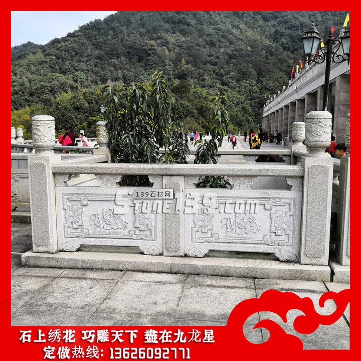 石雕欄桿欄板的花板可以雕刻有著大量的對美好事物的(比如花鳥蟲魚等等)或者傳統的(梅蘭竹菊等等)圖案,具有古樸美觀的造型,還具有傳統的審美意境。龍鳳呈祥圖、牡丹戲鳳圖、華封三祝圖、福壽三多;、錦上添花圖、蝙蝠題材圖,還有;鹿;魚;等動物圖案,寓意吉祥幸福的含義,大體上說村莊和景區橋面一般都雕刻吉祥花鳥等圖案。石雕欄桿多少錢一米?