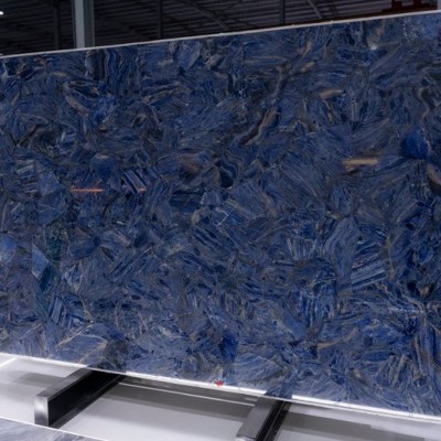 奢石景泰藍奢石景泰藍的紋理極具特色:整體以濃郁的深藍色為基底,紋理呈現出類似絲狀、片狀的晶體交織形態,這些紋理相互纏繞、交錯,形成了復雜且富有動感的圖案。其中還夾雜著淺藍、灰藍以及少量金色的紋理線條,如同在深藍色的畫布上自然暈染、穿梭,整體紋理沒有固定的走向,呈現出隨性而又和諧的亂紋效果,每一處紋理的組合都像是天然的藝術創作,給人一種深邃且奢華的視覺感受,仿佛將景泰藍工藝的斑斕色彩與紋理質感濃縮于石材之中。